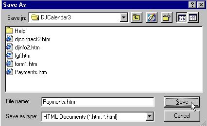 Step 14: You should now see the "Save As" dialog box. Enter a descriptive filename for your new custom form and click the button labeled "Save". In this illustration, we will save our custom form with filename "Payments.htm" in the directory "C:\Program Files\DJCalendar4\". (Note: Since your creating custom HTML forms, all of your custom forms will have a ".htm" extension in their filename. If you were to type "Payments" instead of "Payments.htm", this program will automatically append a filename extension of .htm)