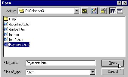 Step 18: You should now see the "Open" dialog box. Let's locate the "Payments Received" custom form we saved earlier. If you followed the examples above, your custom form should be labeled "Payments.htm" and located in the directory "C:\Program Files\DJCalendar4\". Highlight the file, Payments.htm, and click the button labled "Open".