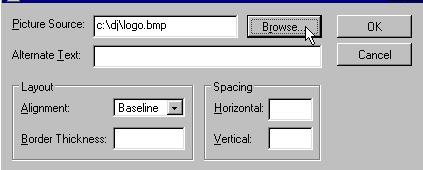 Step 4: You should now see a dialog box prompting you to enter the location of your logo file. In the illustration below, our logo file, logo.bmp, is located in the directory "c:\dj\". If you are not sure where your logo file is located, simply click on the button labeled "Browse" which will give you the opportunity to manually browse your computer's directories to locate your logo file. Once you have found your logo file, click the button labeled "OK". (Note: You can experiment with the other settings such as "Border Thickness", "Alignment", a little later. You can also insert pictures stored on a website by entering the URL address i.e. http://www.djcalendar.com/images/logo.gif )