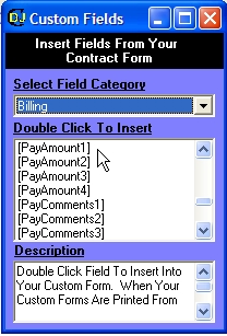 To insert a field, simply click or point your cursor in the exact location on the custom form, then select the custom field from the drop down box, and double click on the field name