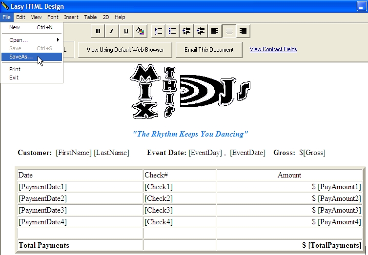 Step 12: You should now see your new table with rows and columns. Since we are creating a "Payment Schedule Form", the following illustration will show you how to insert the custom payment fields into your form. This DJCalendar program enables you to use "fields" to insert into your custom forms which will be converted to the actual clients data once printed from the Contract Form. All data that is entered on the Contract Form can be inserted into your custom form using the "fields" available. Since you have made it this far, we're assuming that you already know that this DJCalendar program allows you to store up to 4 separate Payments Received by your client. Each Payment Received can contain a Payment Date, Payment Check #, and Payment Amount. We will now insert these custom Payment fields into our table. First, lets display the fields we can use for our custom forms. Simply click on the blue label "View Contract Fields", a box will pop up with the various field names you can use in your custom forms.